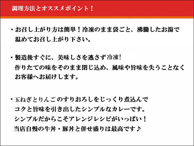 商品詳細名称カレー内容量1袋200g入原材料名たまねぎ(国産)、カレールウ、糖類(砂糖、果糖ぶどう糖液糖、ぶどう糖果糖液糖)、植物油脂(なたね油)、りんごピューレー、カレー粉、トマトペースト、にんにくペースト、チキンエキス、がらスープ、香辛料、ポークエキス、ジンジャーペースト/カラメル色素、調味料(アミノ酸等)、(一部に乳成分・小麦・大豆・鶏肉・豚肉・りんご・やまいもを含む)賞味期限商品に記載保存方法冷凍(ー18℃以下) 栄養成分表示 カレー:(1食200gあたり) エネルギー 224kcal たんぱく質 2.4g 脂 質 13.0g 炭水化物 25.0g 食塩相当量 2.2g