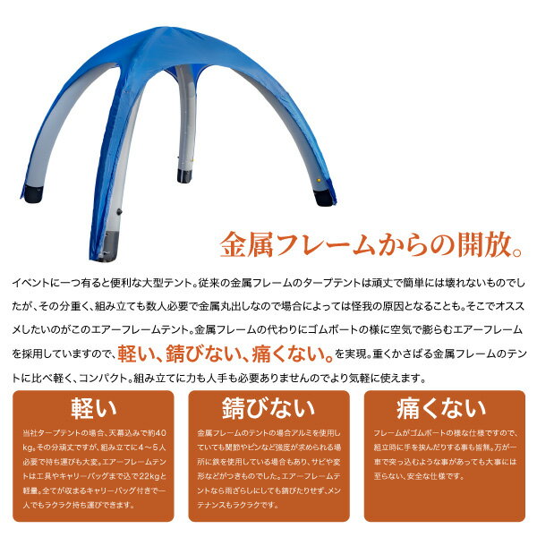 商品内容■インフレータブルエアーテント3m商品詳細■サイズ:幅3m×3m、高さ2.5m■重量:約22kg(付属品込み)■カラー:黒天幕×灰フレーム、青天幕×灰フレーム、灰天幕×白フレームの3色■気室:4(フレーム)/1(日除け)■付属品:天幕×1、日除け×1、横幕×3、ジッパー付き横幕×1、ウォーターバッグ×4、日除け用部品×5、100vエアーコンプレッサー×1、ペグ×16、ペグ用ロープ×16、パンク修理パッチ×4、パンク修理接着剤×1、補修用布×2、キャリーバッグ×1■簡易英/中文取扱説明書付き■簡易日本語取扱説明書付き注意事項■実際にご使用になる前に必ず一度組み立てて不具合や不足部品が無いか確認してください。
