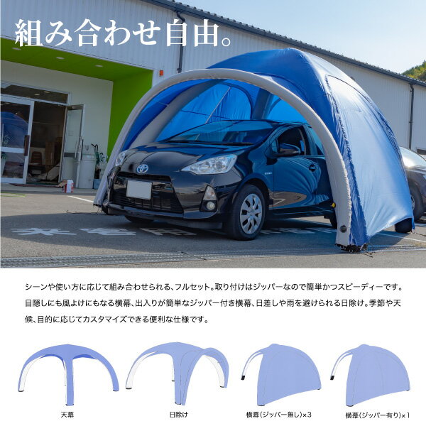 日差しや雨を防ぐ日除け、壁となる横幕、入り口として使えるジッパー付き横幕、素早い組み立てを実現するハイパワーコンプレッサー等付属品も充実。